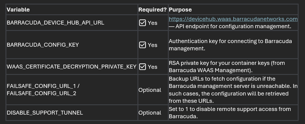When deploying your WAF container, you’ll need to provide certain environment variables. Some are required for the container to run, while others are optional for customization.